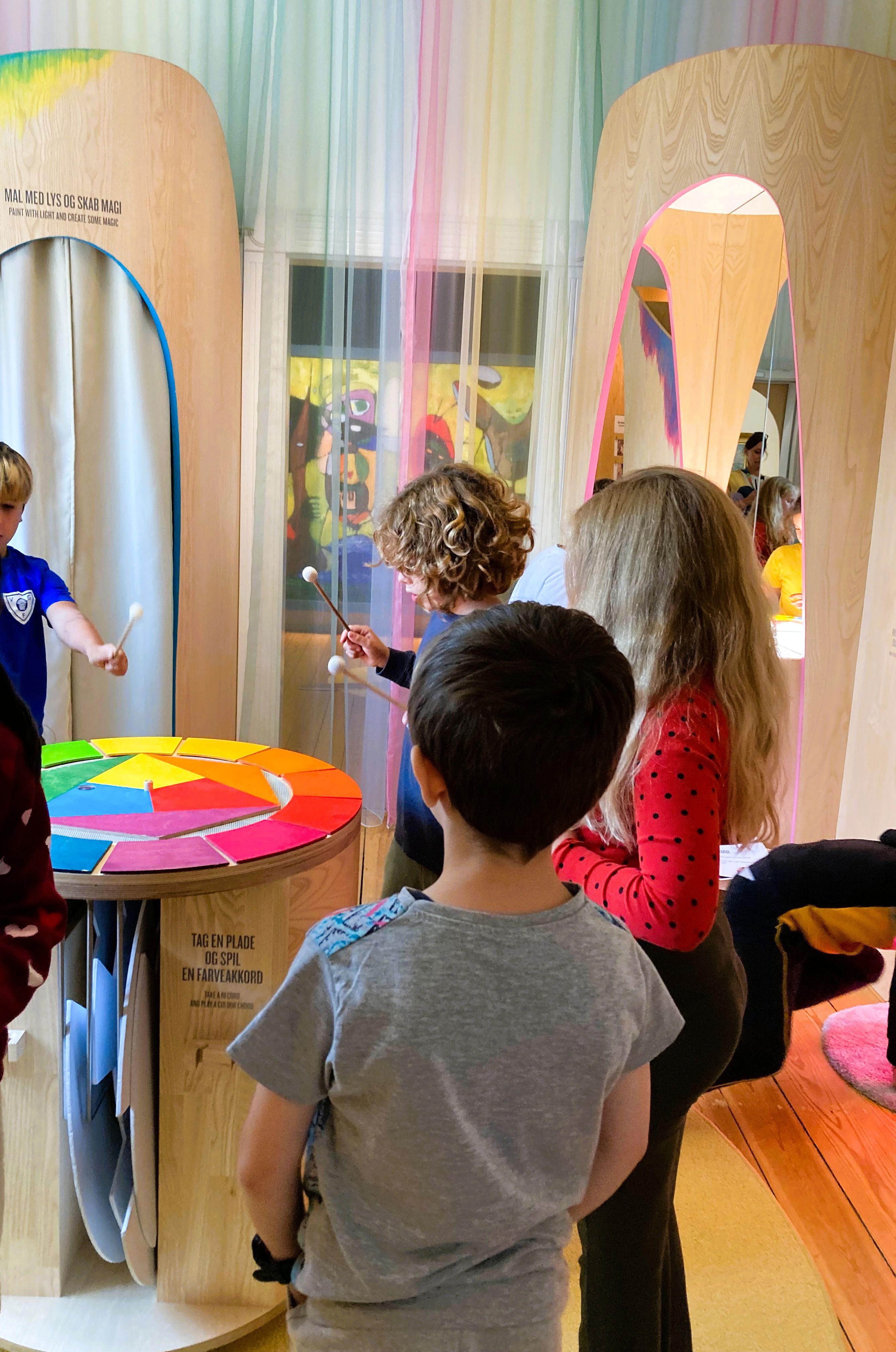 Vi fortsætter rejsen ind i 'Sanseværk', museets særlige oplevelsesrum for børn, hvor eleverne får mulighed for at udforske kunstens elementer med hele kroppen. Her bygger de skulpturer i abstrakte former, dufter til farver, spiller farvetoner og kravler gennem farvecirklen.