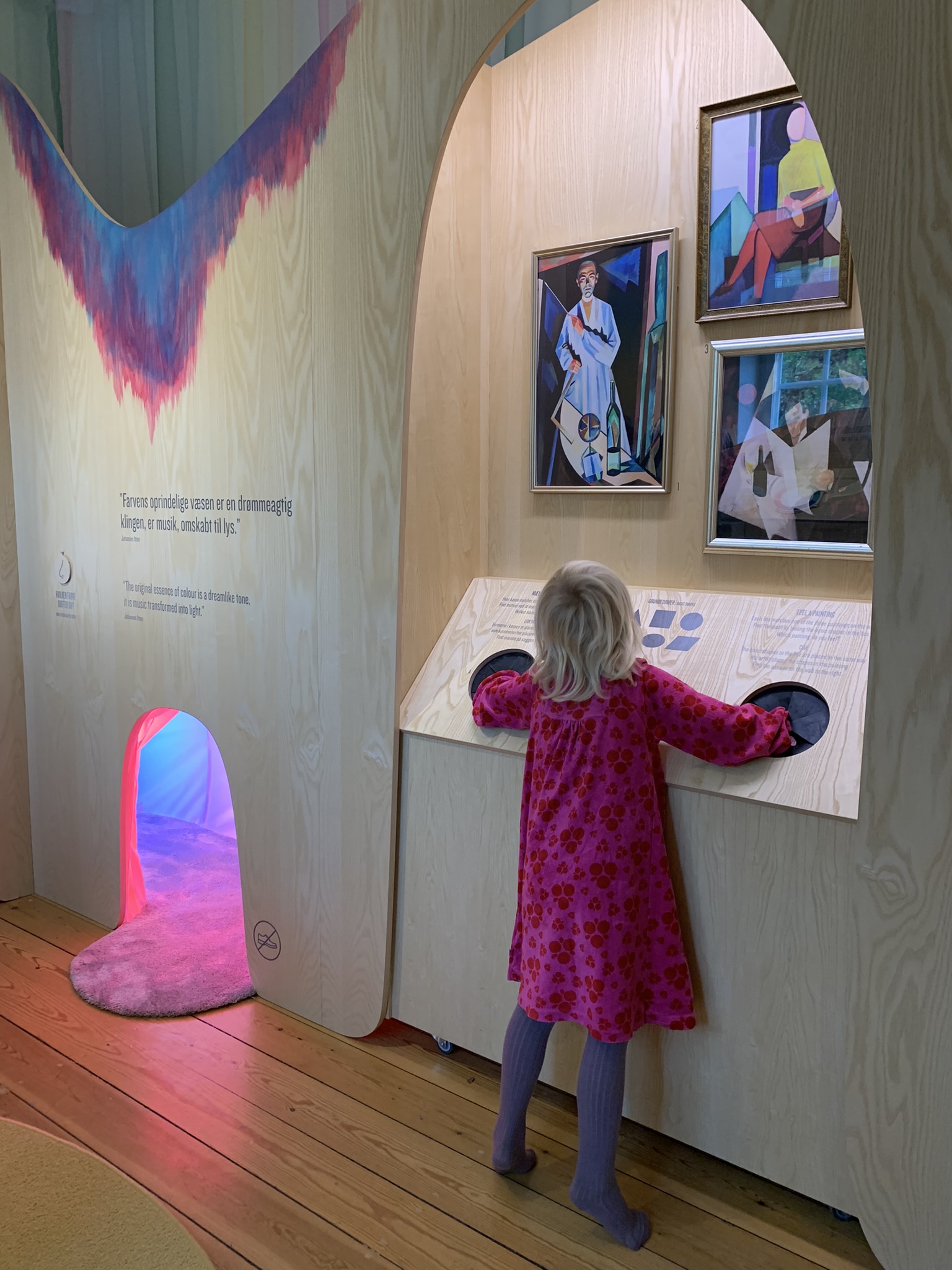 Vi fortsætter rejsen ind i 'Sanseværk', museets særlige oplevelsesrum for børn, hvor eleverne får mulighed for at udforske kunstens elementer med hele kroppen. Her bygger de skulpturer i abstrakte former, dufter til farver, spiller farvetoner og kravler gennem farvecirklen.