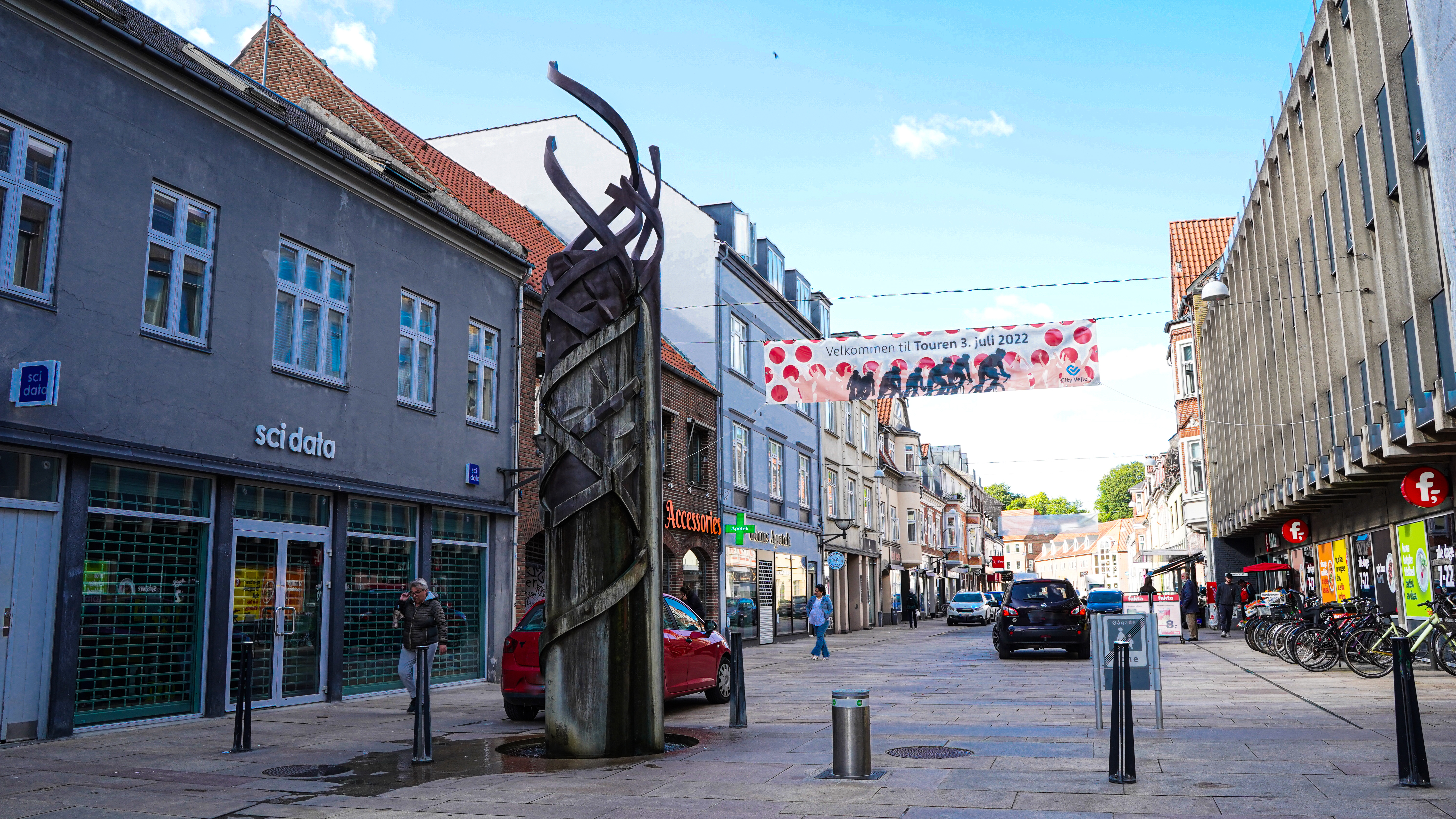 Vandsøjlen du står foran hedder Helix, hvilket også betyder "spiral” på engelsk. Det henviser til det snoede bånd om skulpturen, med de tre rislende vandløb ned langs siderne. Skulpturen er en hilsen til de brønde, der stod i alle danske byer i middelalderen – i Vejle stod bl.a. "Byens Kilde" på Rådhustorvet.