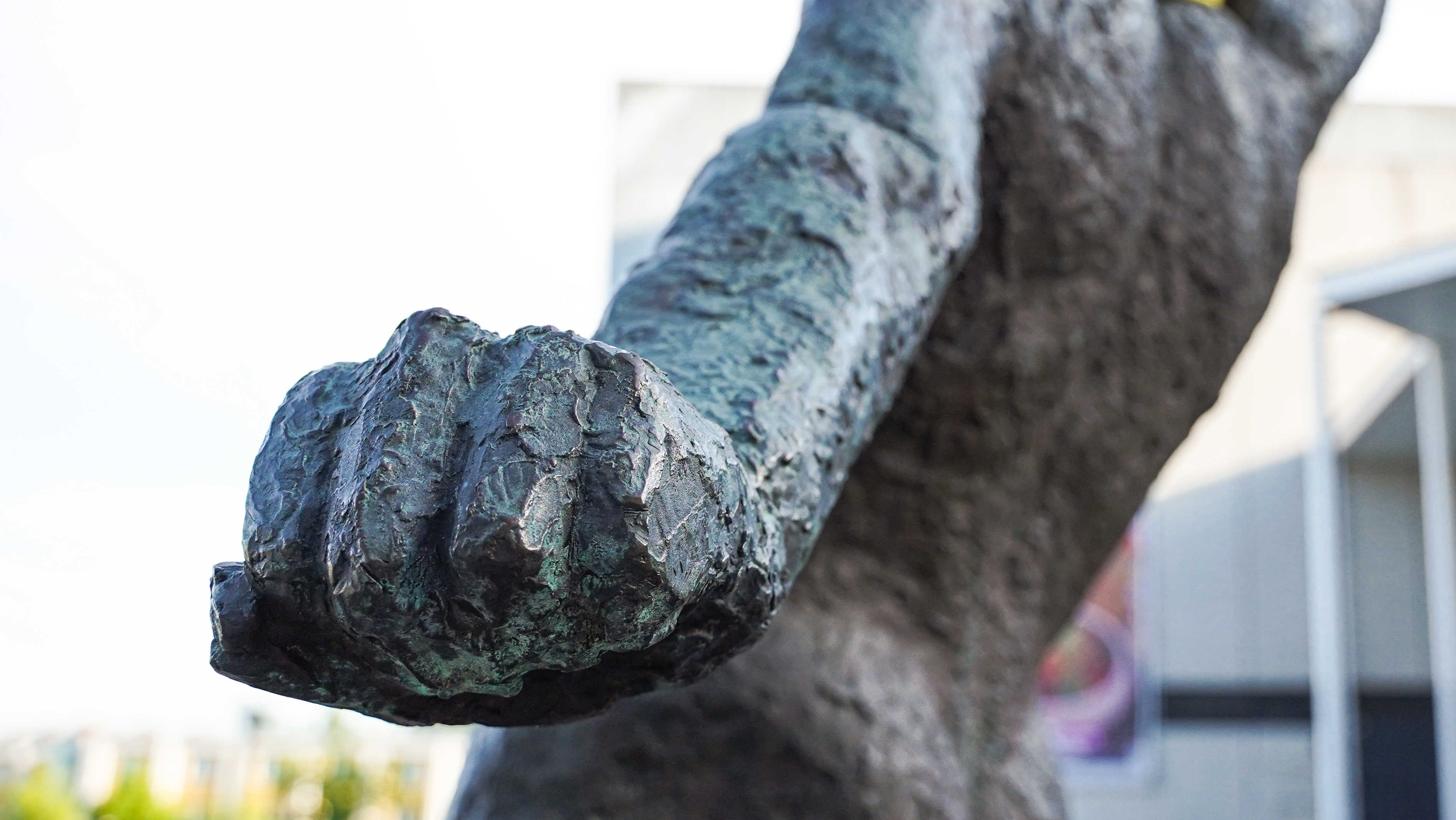 På skulpturen her, kan man fornemme kunstnerens baggrund som sportsjournalist, og hvordan han har iagttaget fodboldspillere og deres glidende tacklinger.