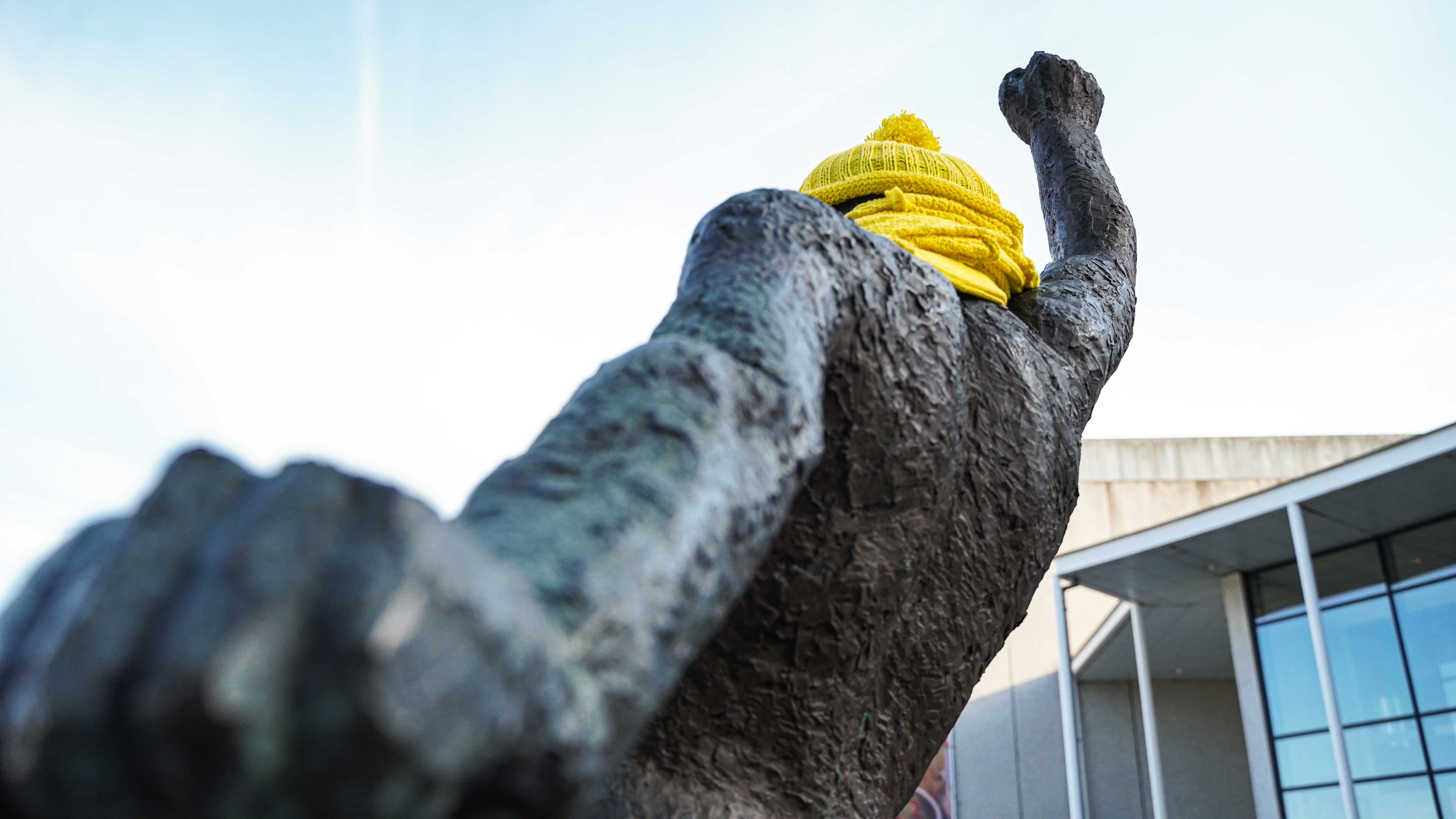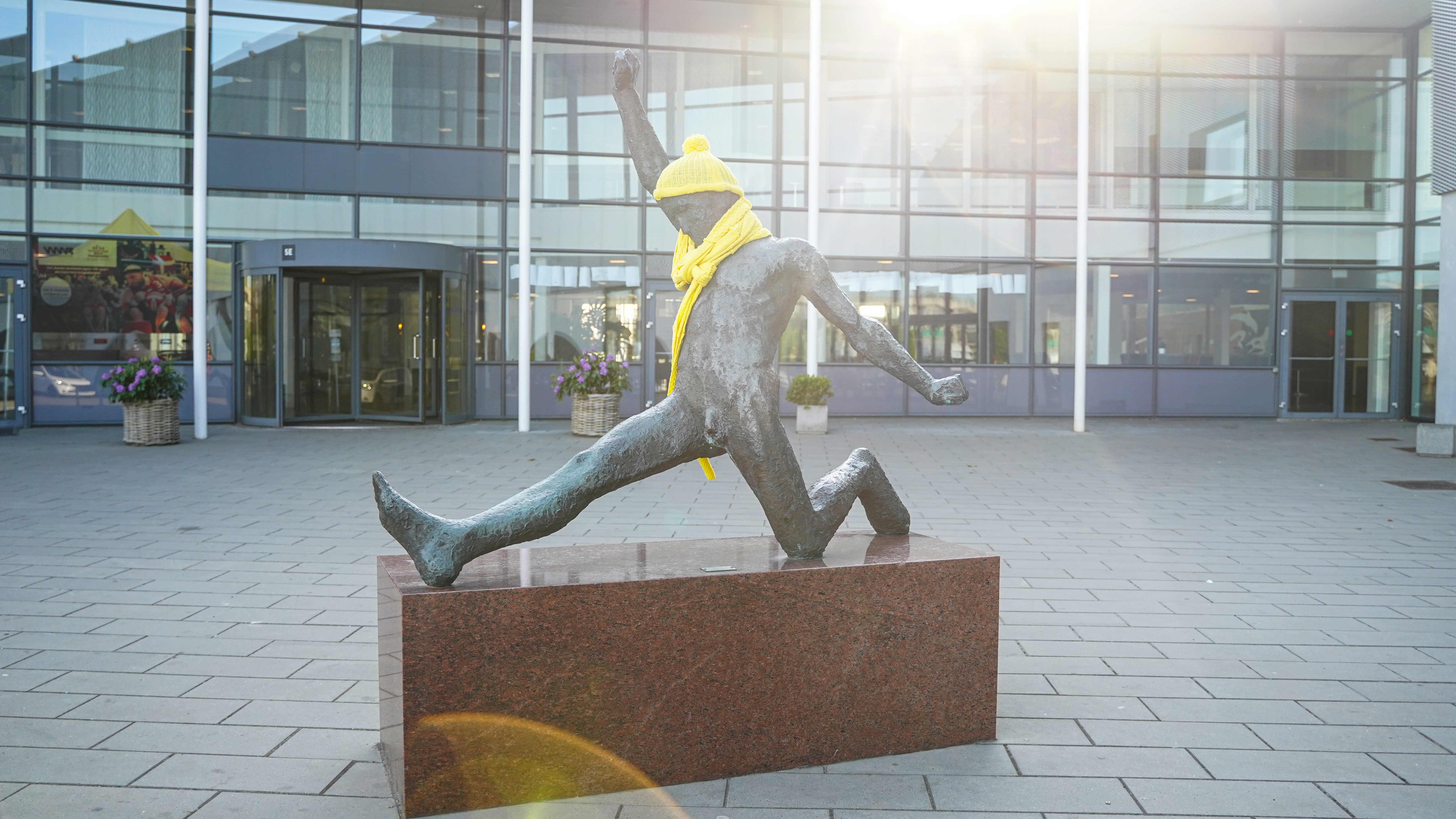 NB: Skulpturen er midlertidigt udsmykket med halstørklæde og hue i gul strik, i forbindelse med Tour de France d. 3. juli 2022.