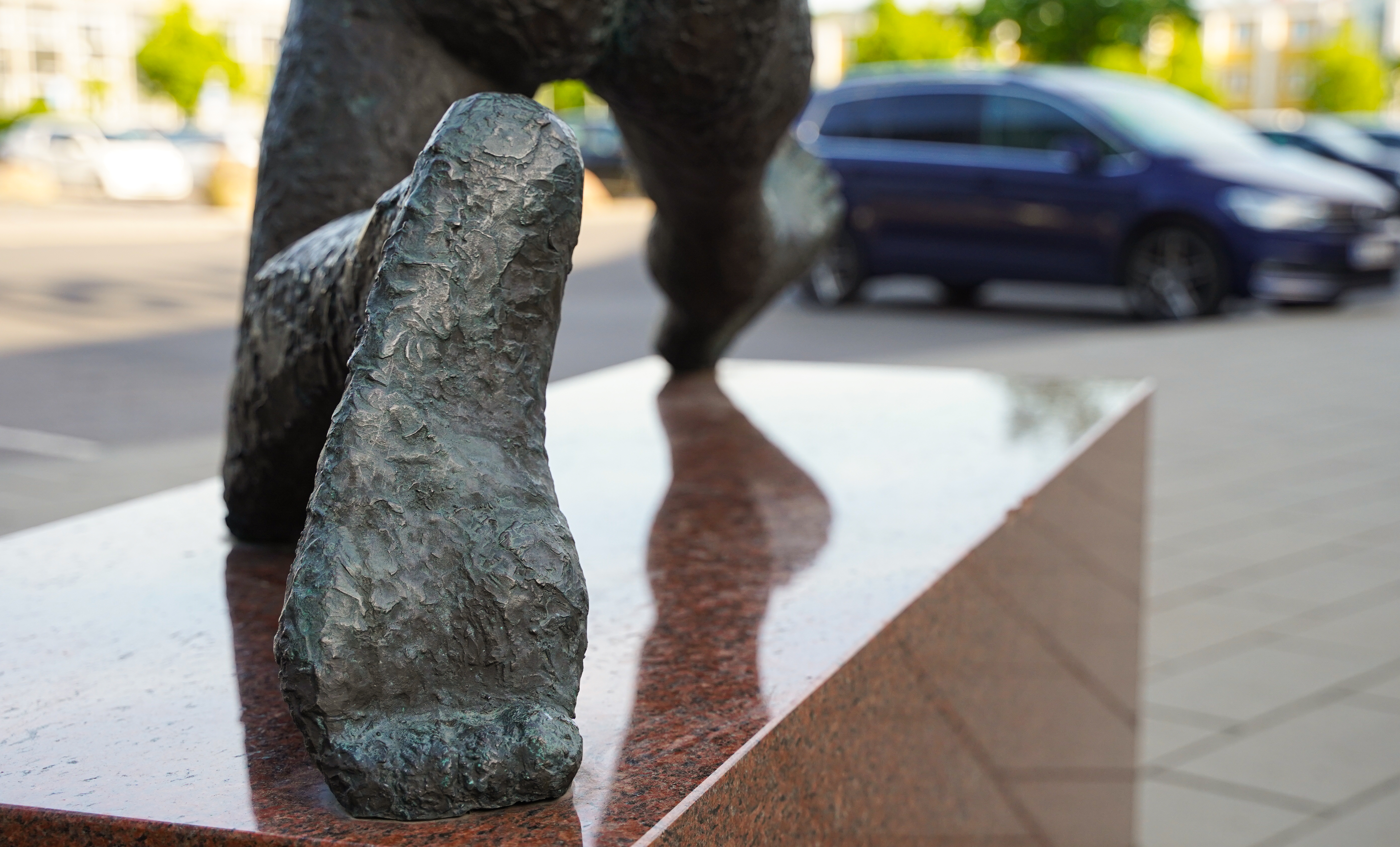 NB: Skulpturen er midlertidigt udsmykket med halstørklæde og hue i gul strik, i forbindelse med Tour de France d. 3. juli 2022.