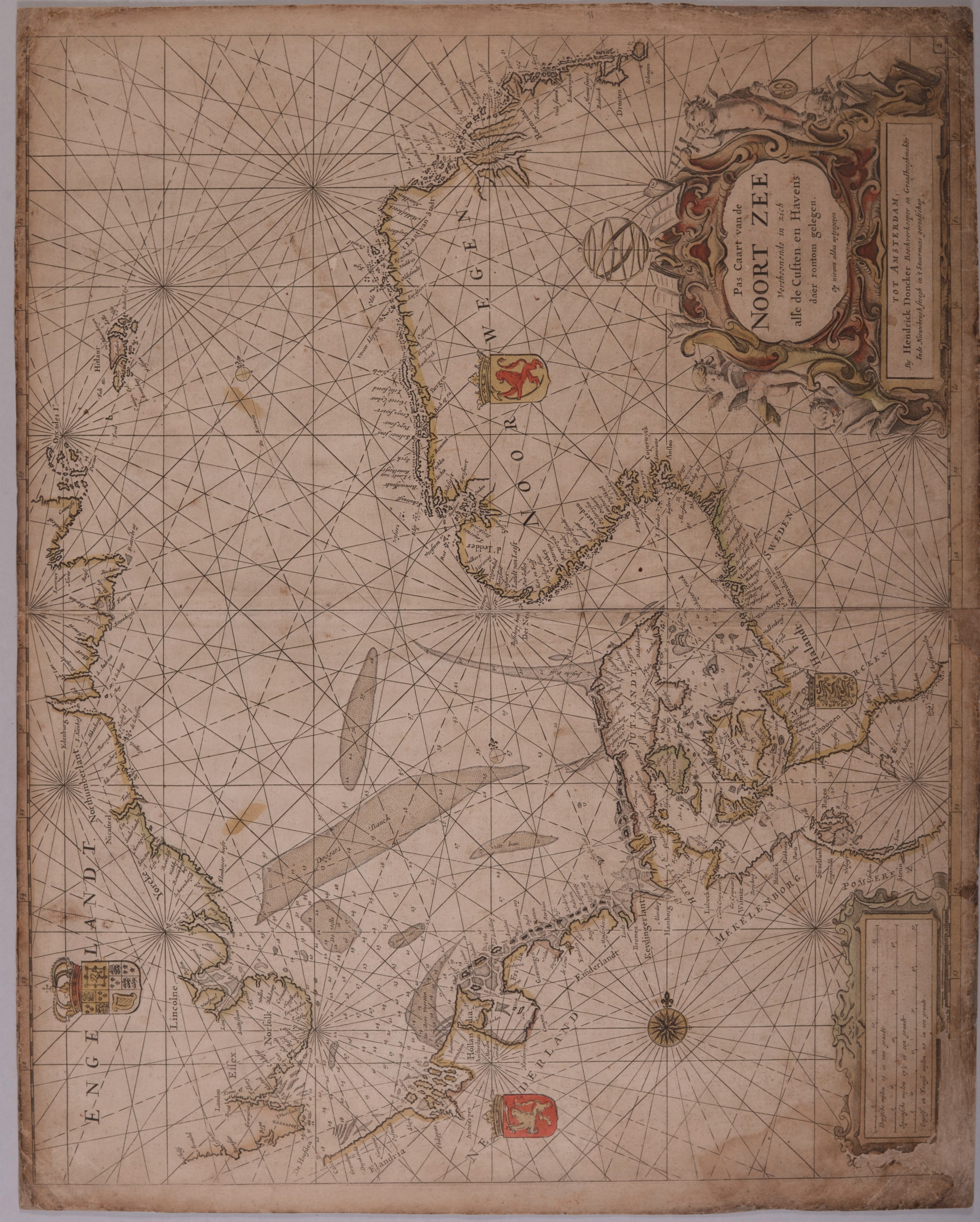 Hendrick Doncker producerede også søkort over Nordsøen og Østersøen, som ses på billederne ovenfor. Bemærk, at det danske rigsvåben er placeret midt i Skåne på trods af, at Danmark havde mistet denne landsdel ni år tidligere. Bemærk også, at kortet over Østersøen i nederste højre og øverste venstre hjørne har et indsejlingskort til den vigtige havneby Danzig indtegnet.